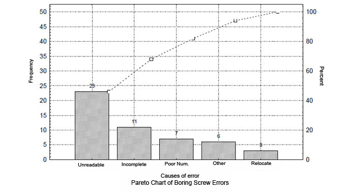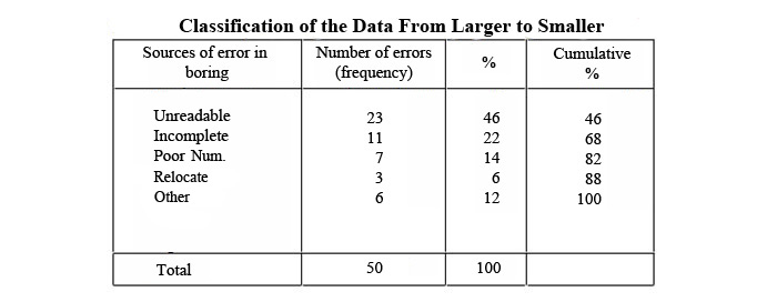 For a specific period(month, 3 months, etc.), the sample data is collected about all the elements which will be examined. Boring errors are classified as, unreadable, incomplete, poor numbering, relocation, other and total number of errors for each one of them is written for specified period. Then their rates in total fault is found. For example unreadable, (23/50) * 100 = 46%. And in the last column above are cumulative totals.