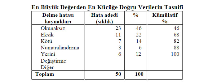 Belli bir dönem aralığında, (aylık, 3 aylık vb.) incelenecek olan bütün elemanlar ile ilgili örneklem verileri toplanır. Burada delme hatalarının detayları olarak, okunaksız, eksik, kötü numaralandırma, yerini değiştirme, diğer şeklinde sınıflama yapılmıştır ve bunların her birinin hata adedi belirtilen peryod için toplam olarak yazılır. Sonra bunların Toplam hatadaki oranları bulunur. Örneğin Okunaksız için, (23/50)*100 = %46 çıktı. Ve son kolonda da bunların kümülatif olarak aşağı doğru toplamları alınır. 46, (46+22), (46+22+14), (46+22+14+6), (46+22+14+6+), (46+22+14+6+12) olarak 100 değerine ulaşılır.